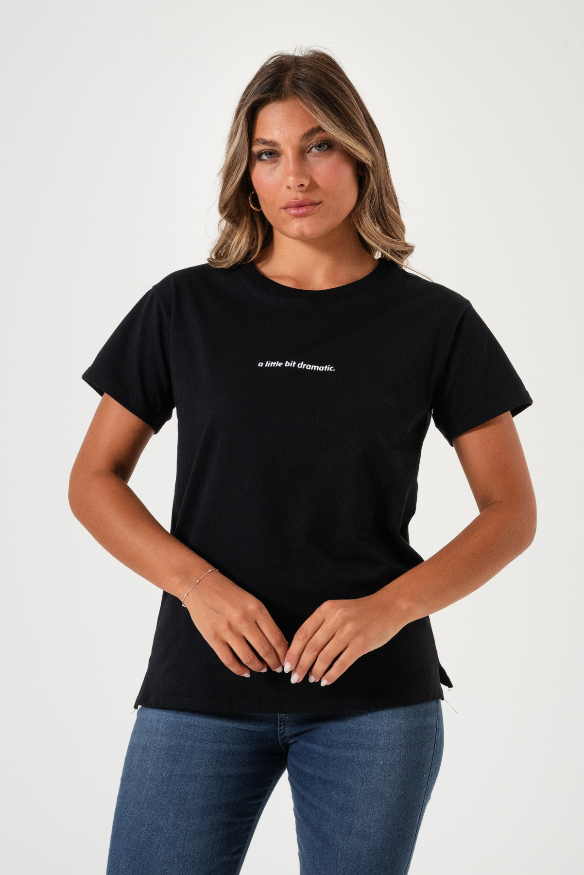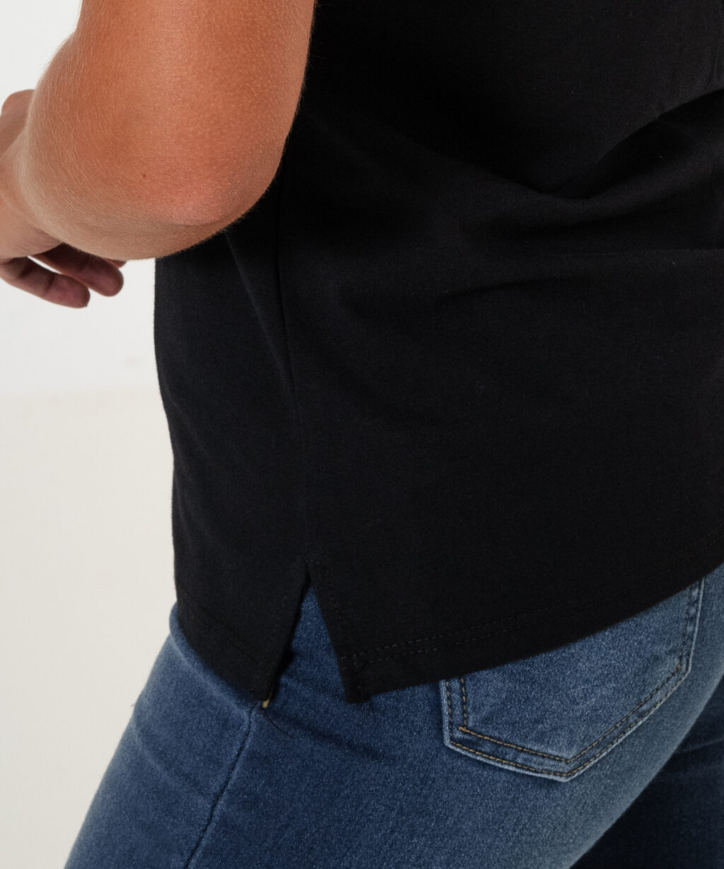 Remera estampada en tela Jersey 100% algodón, cuello redondo y pequeños tajos laterales.