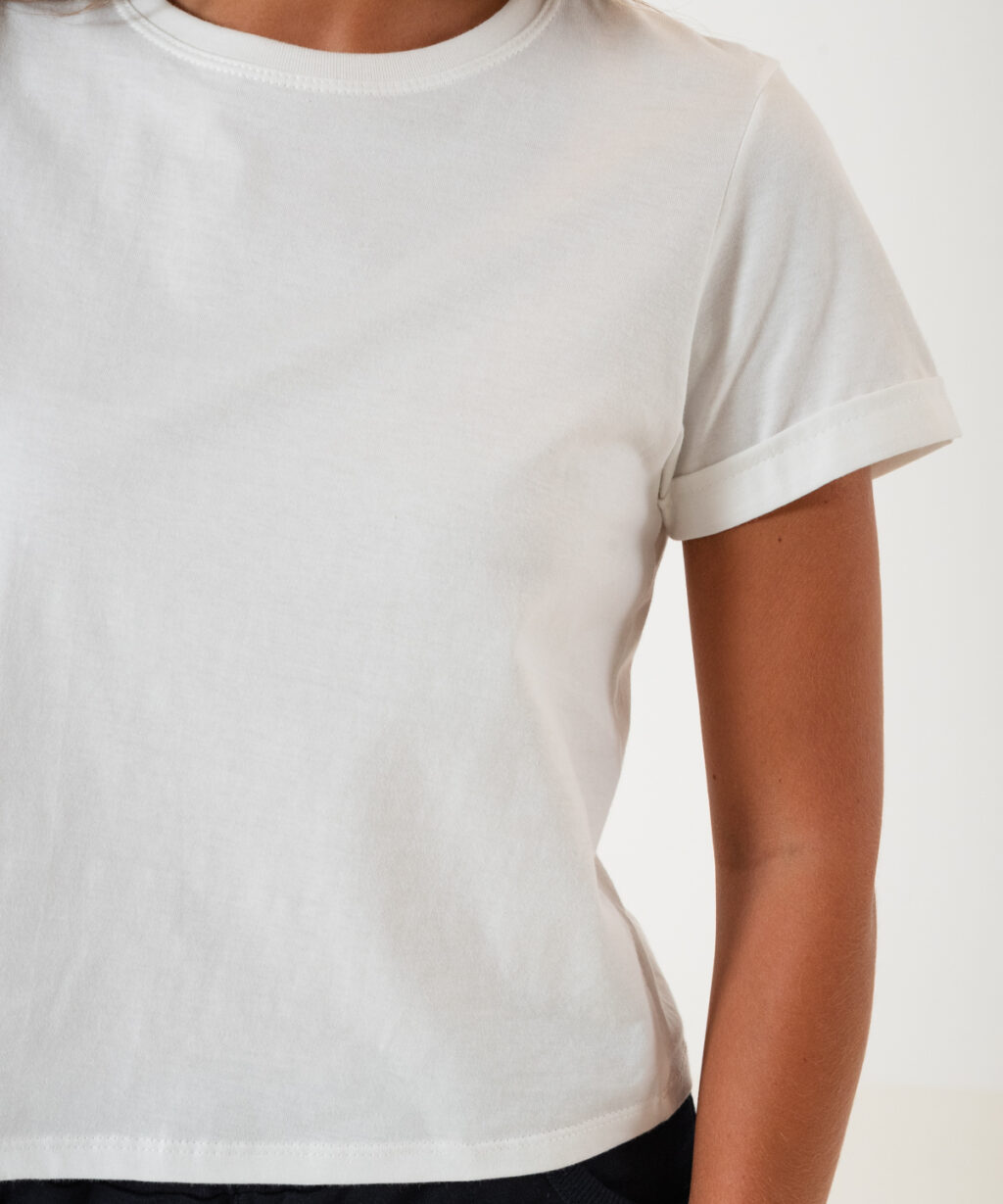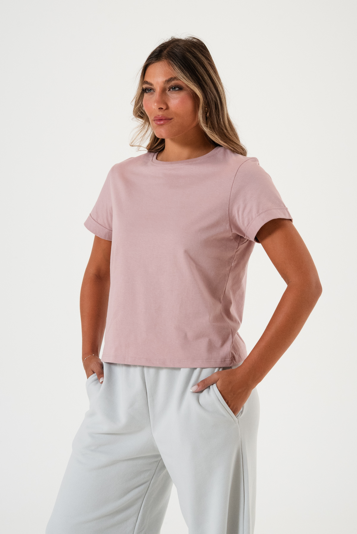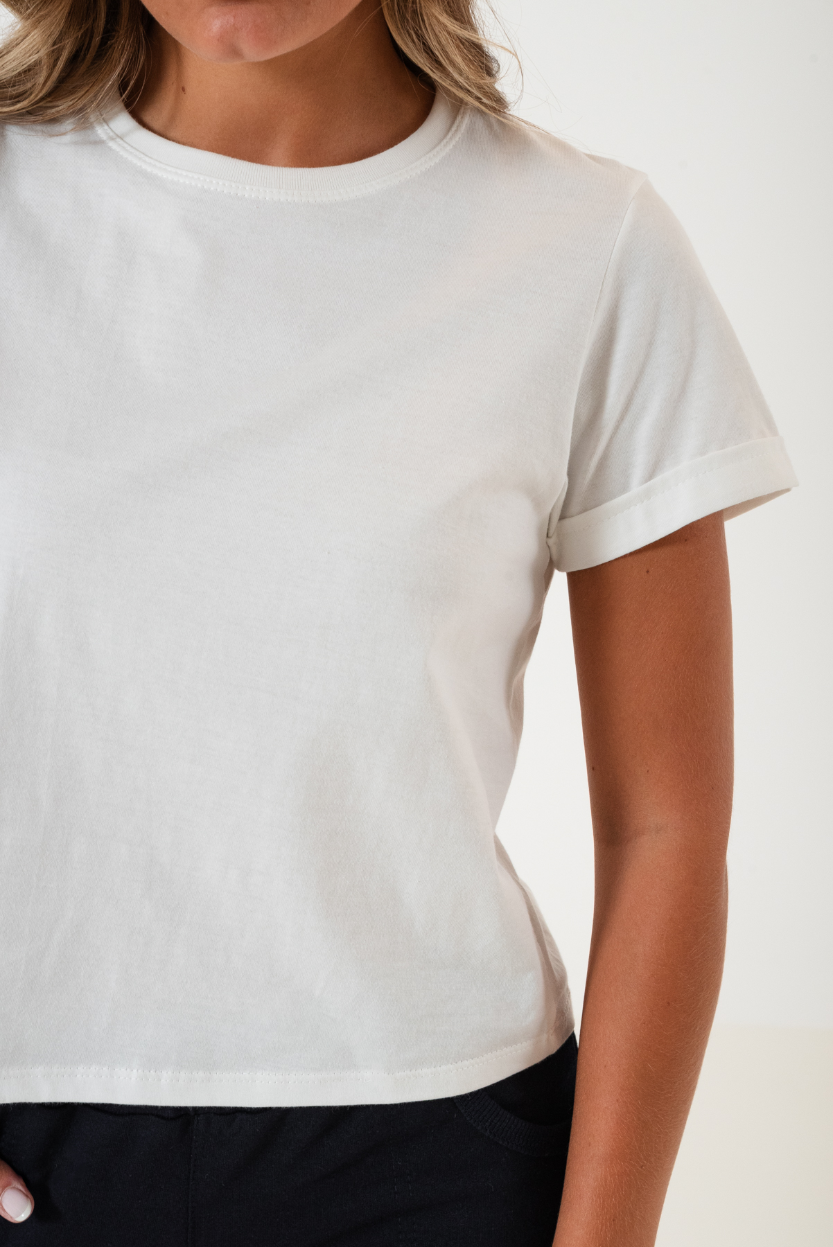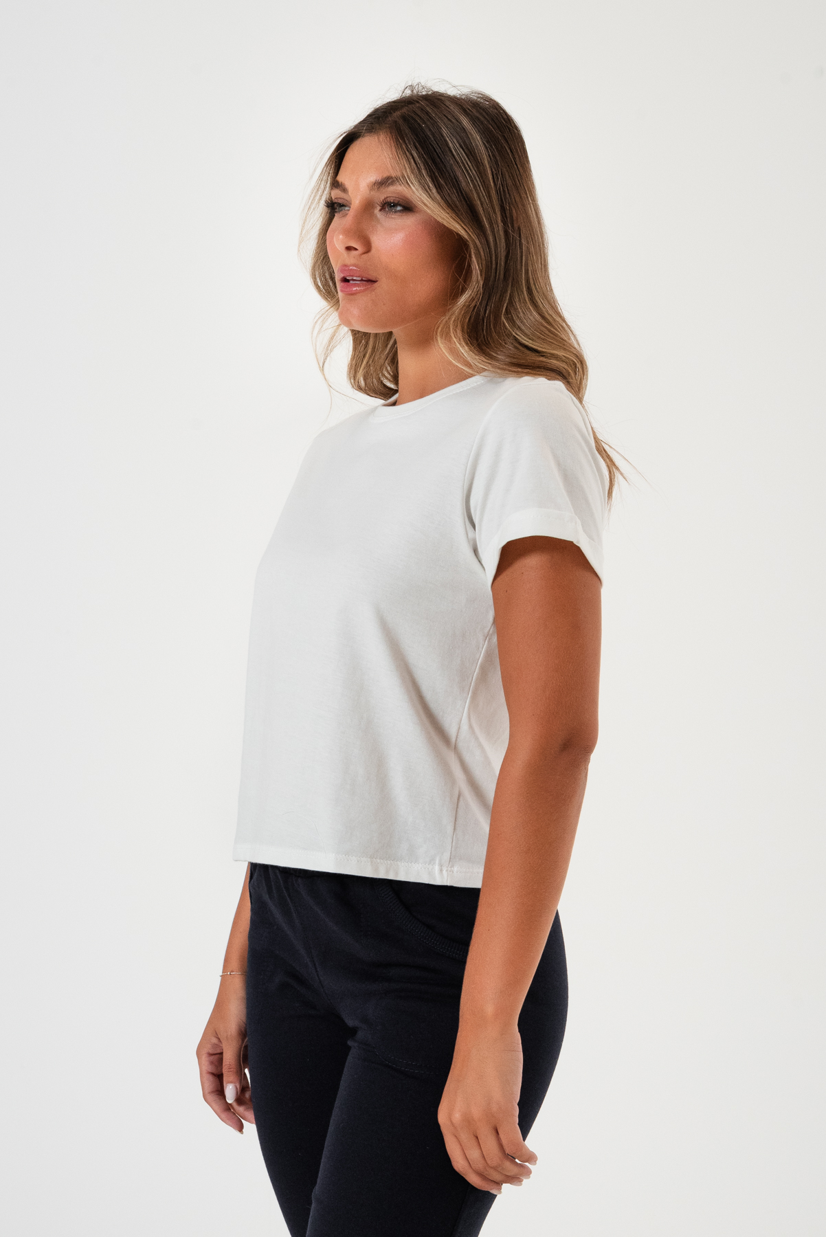 Remera ideal para usar con prendas tiro alto, confeccionada en tela de Jersey 100% algodón, Con detalle de dobladillo en mangas y cuello redondo.
