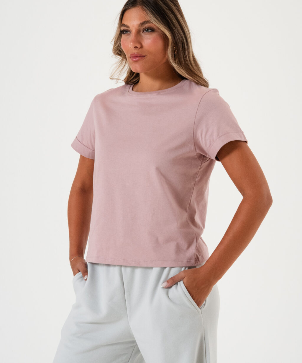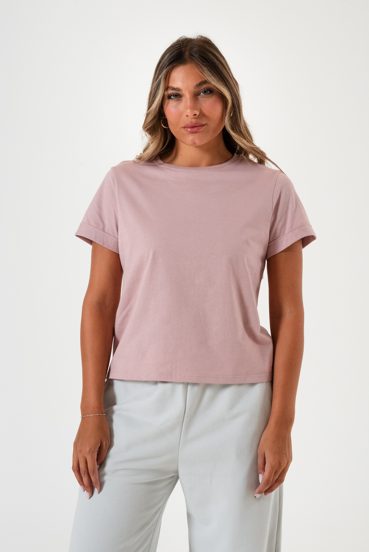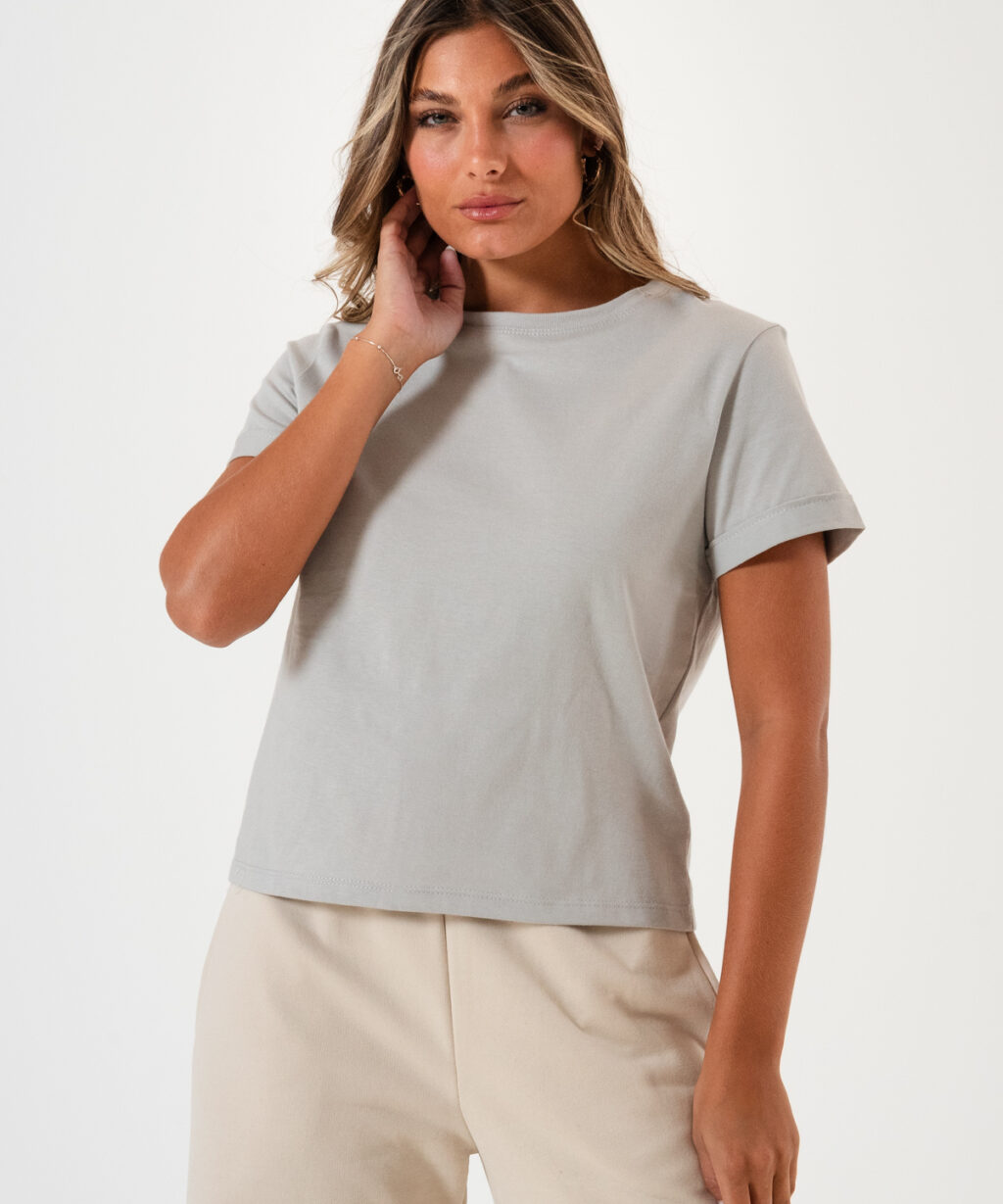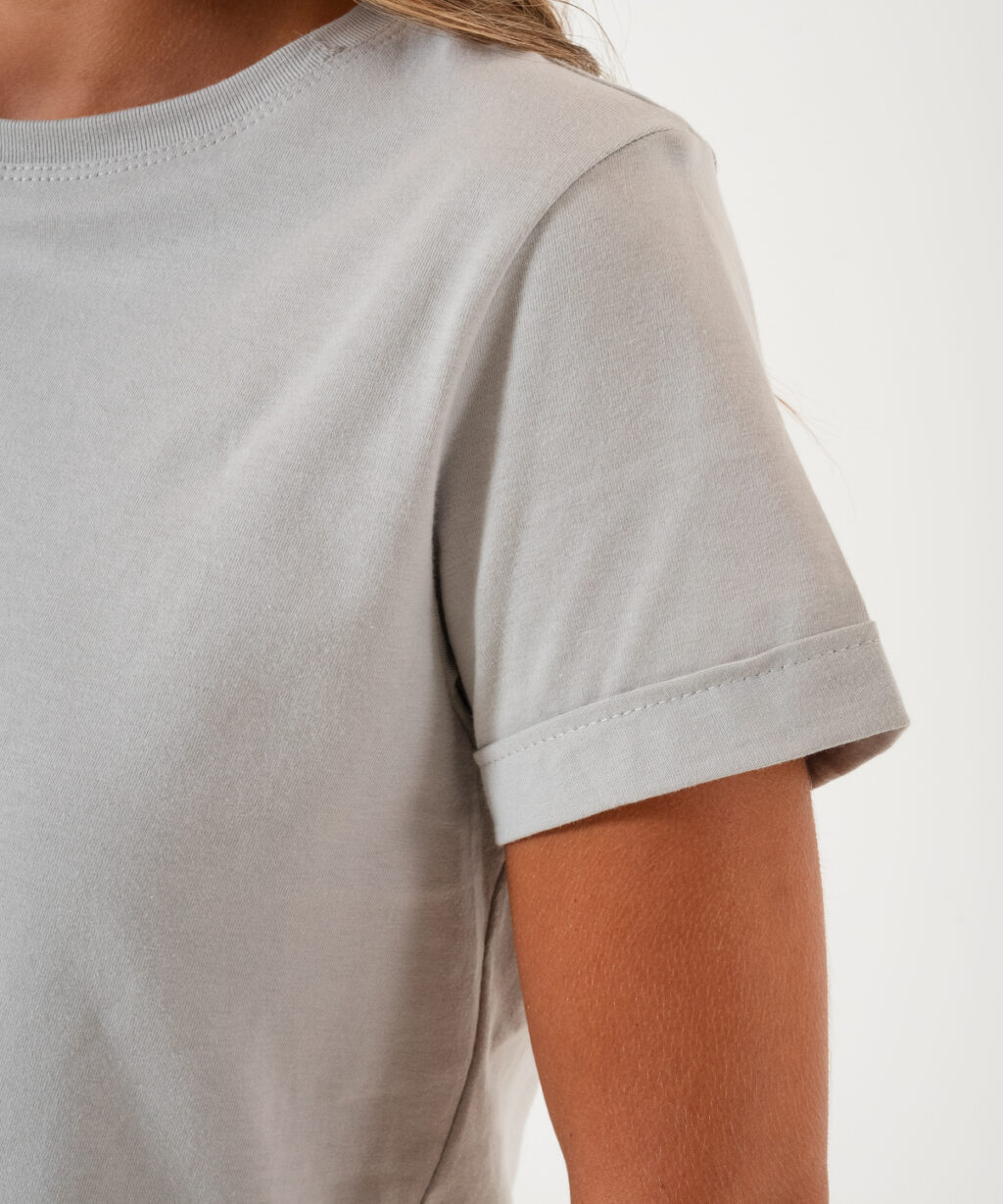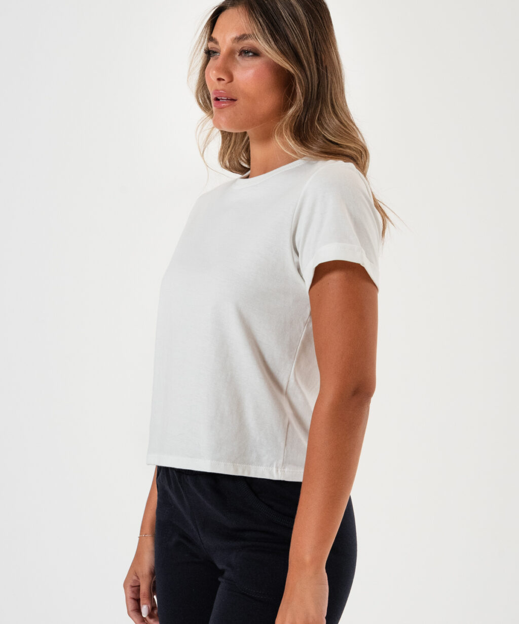 Remera ideal para usar con prendas tiro alto, confeccionada en tela de Jersey 100% algodón, Con detalle de dobladillo en mangas y cuello redondo.