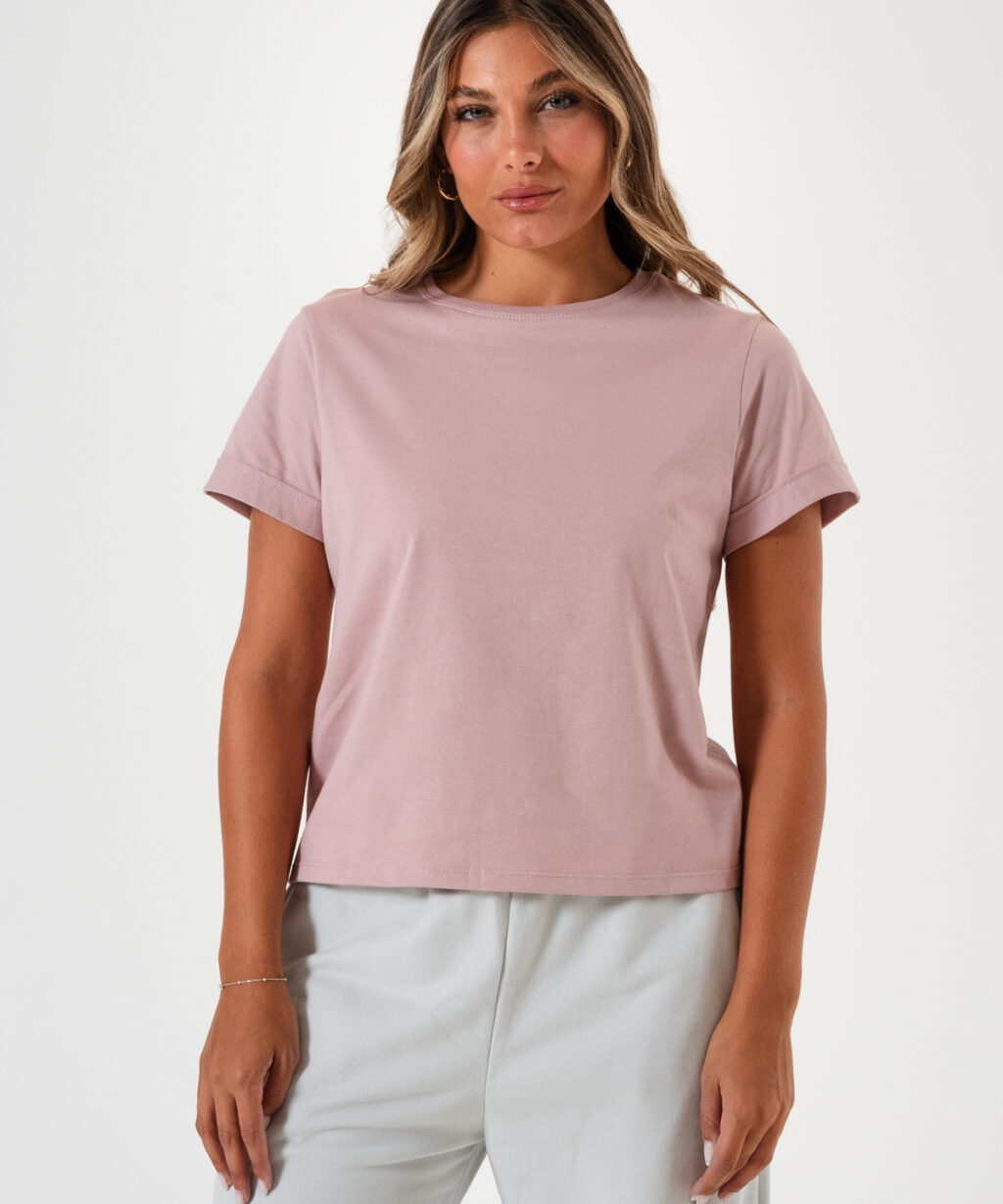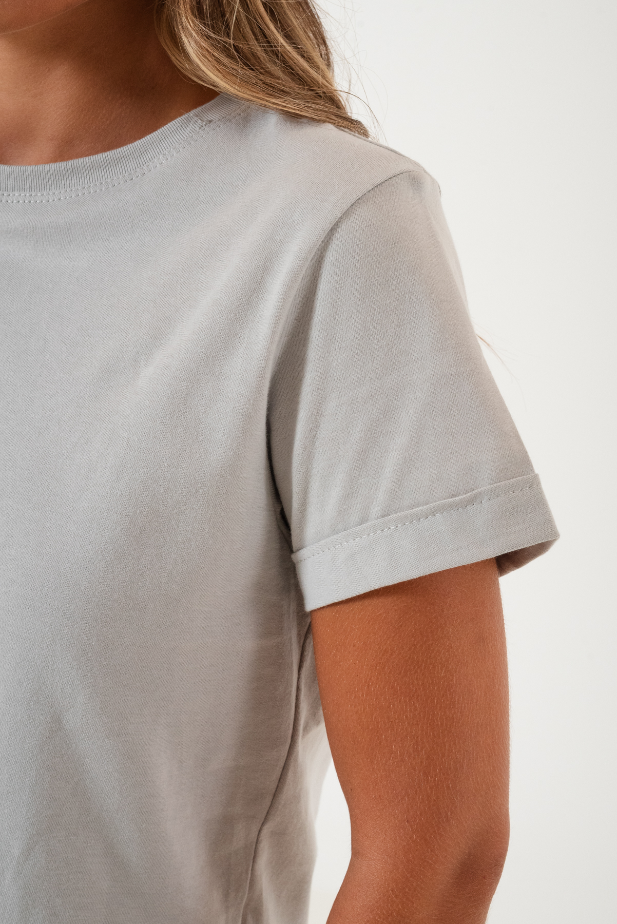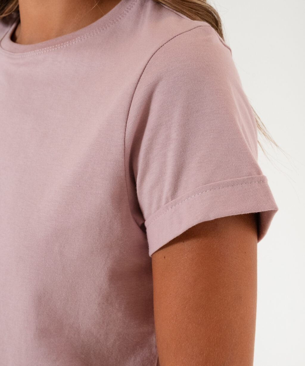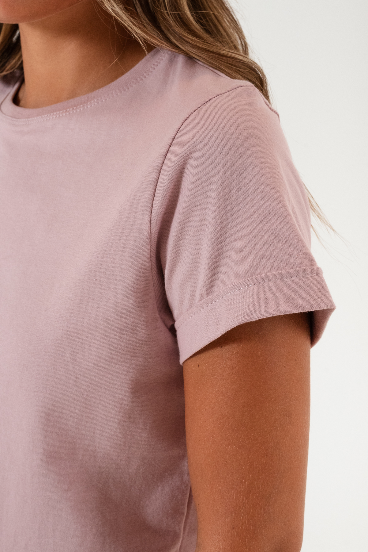 Remera ideal para usar con prendas tiro alto, confeccionada en tela de Jersey 100% algodón, Con detalle de dobladillo en mangas y cuello redondo.