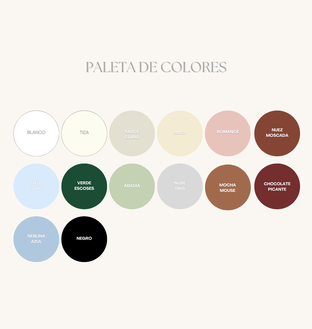 | Color | Chocolate Picante, Cielo Claro, Mocha Mouse, Neblina Azul, Nube Gris, Romance, Abadia, Blanco, Negro, Rayo, Tiza, Verde Escoces |