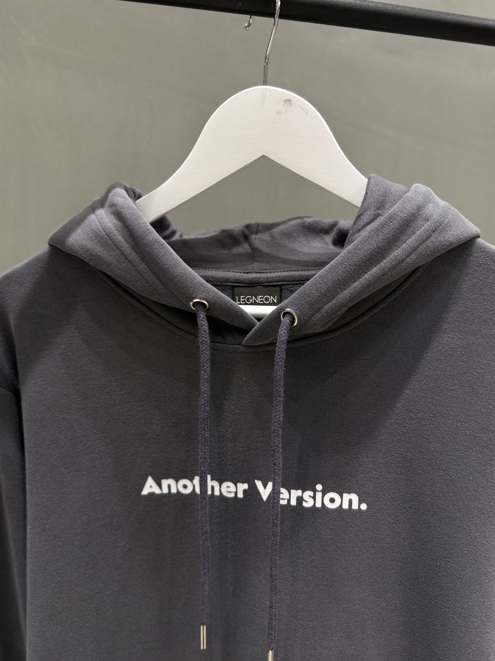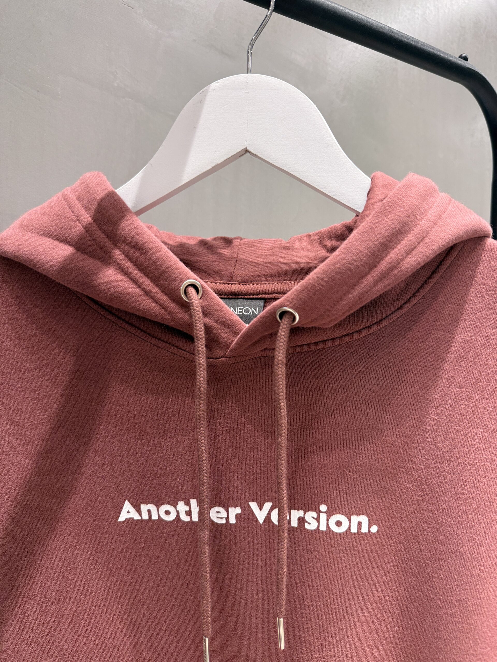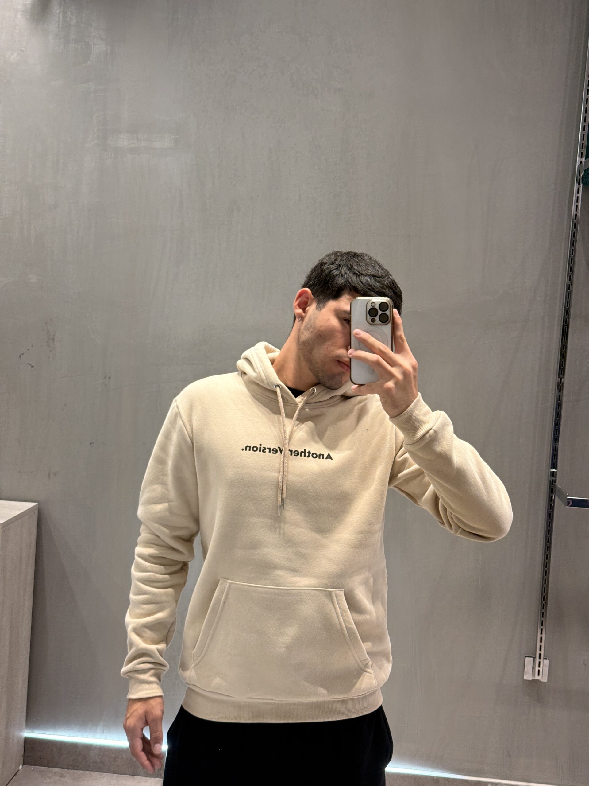 Buzo canguro con capucha forrada, cordon al tono y punteras metalicas.