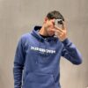 Buzo canguro con capucha forrada, cordon al tono y punteras metalicas.