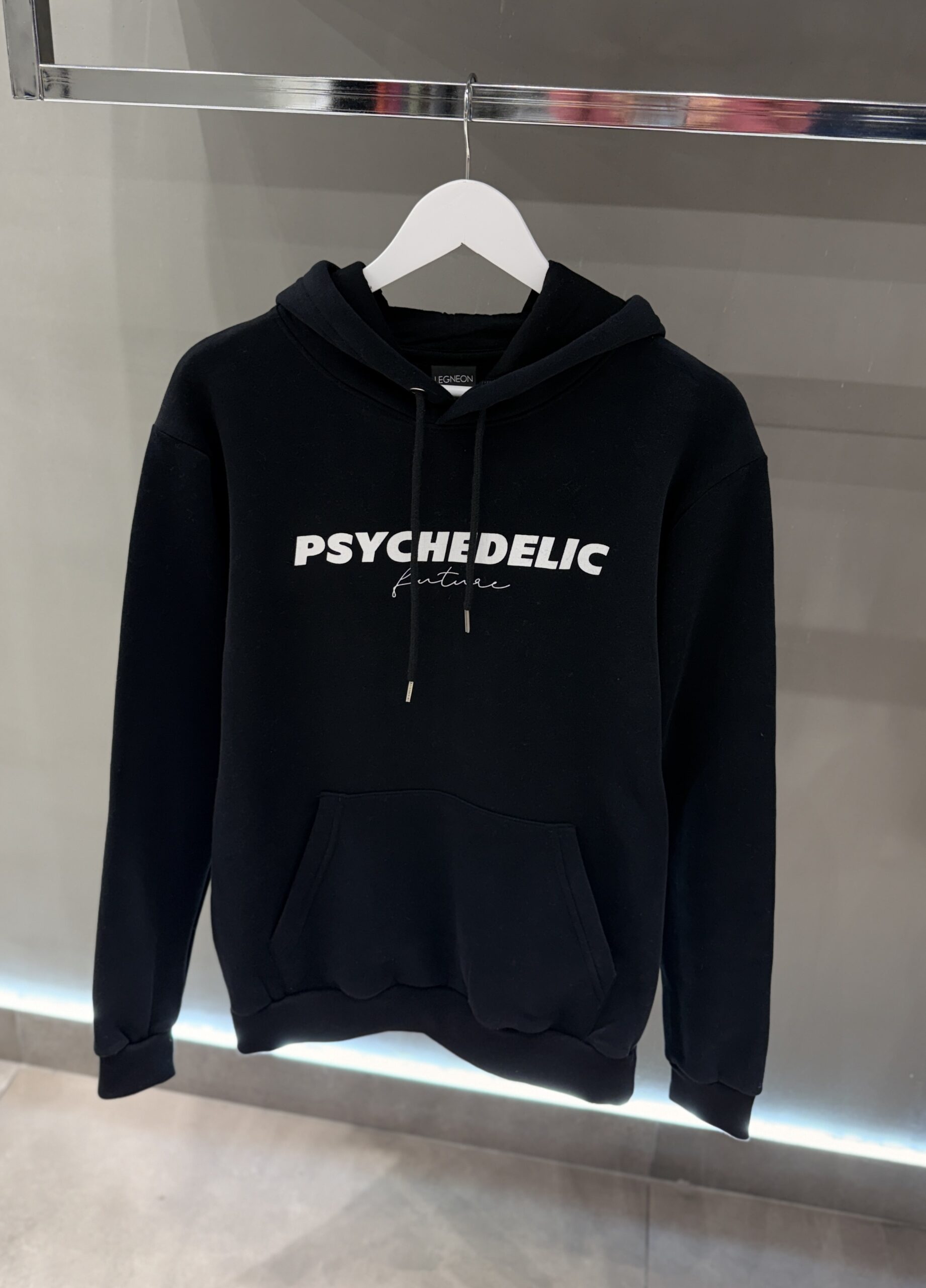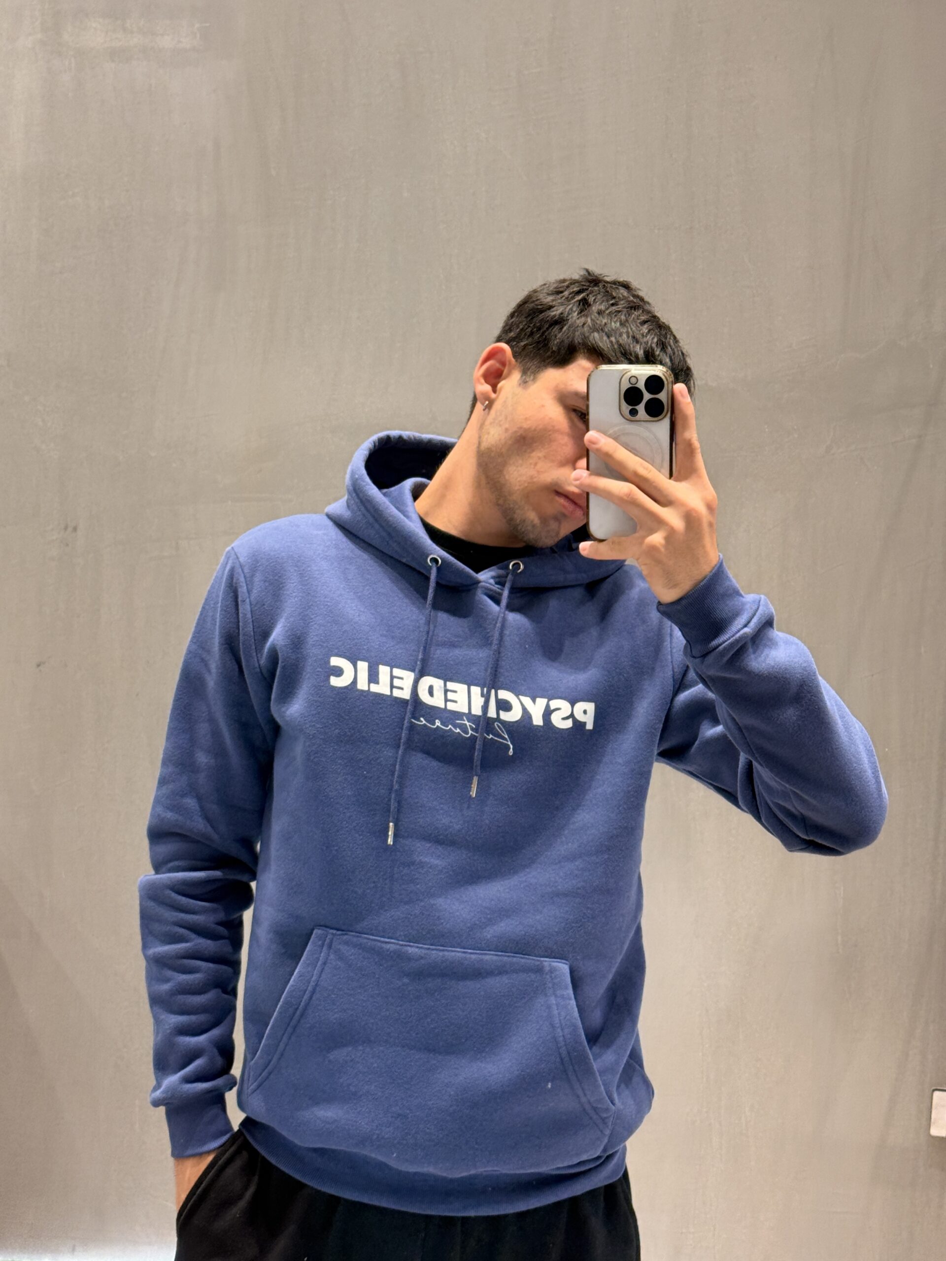 Buzo canguro con capucha forrada, cordon al tono y punteras metalicas.