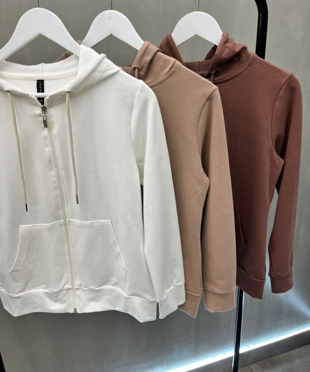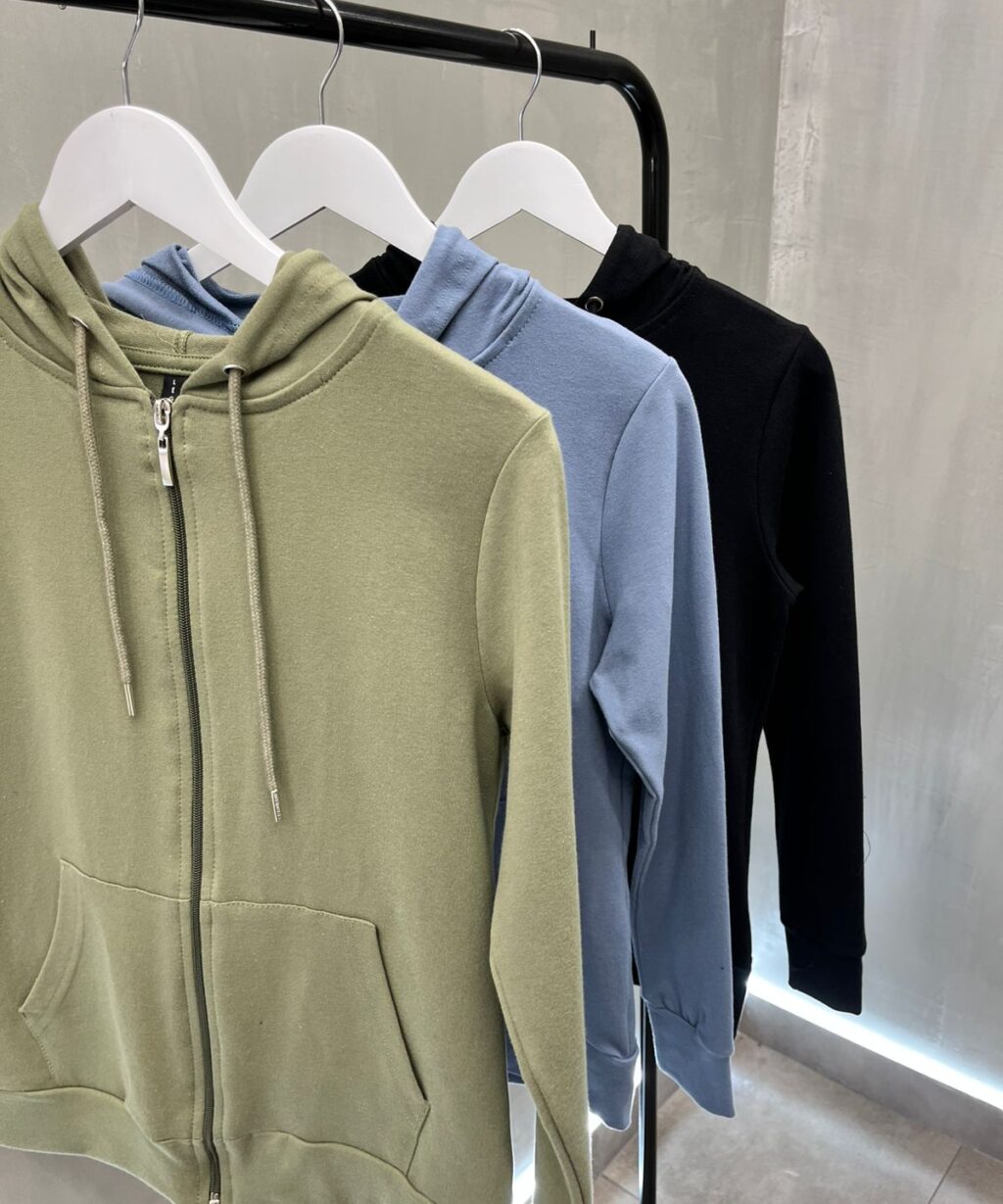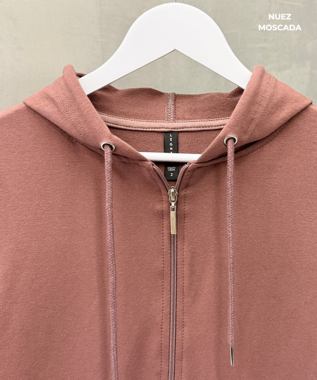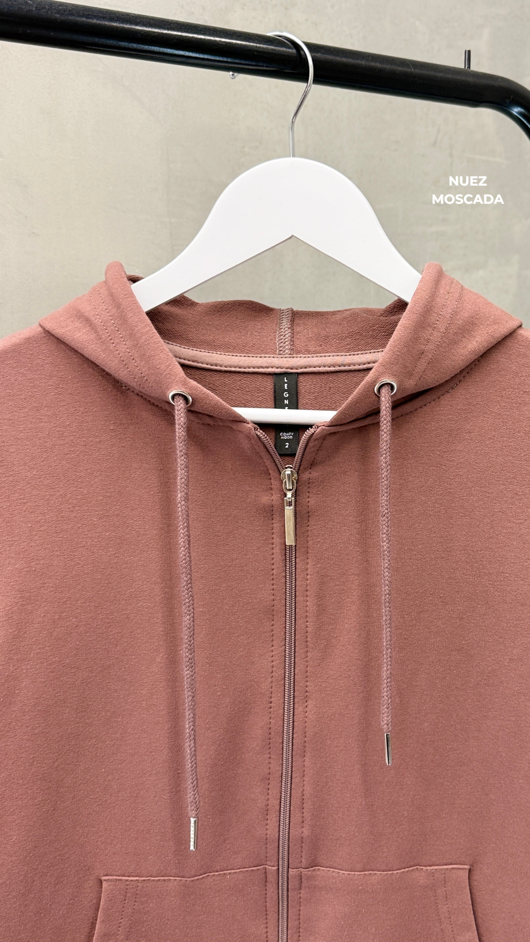 Campera en tela algodón Rustica con elastano, capucha y bosillos delanteros.