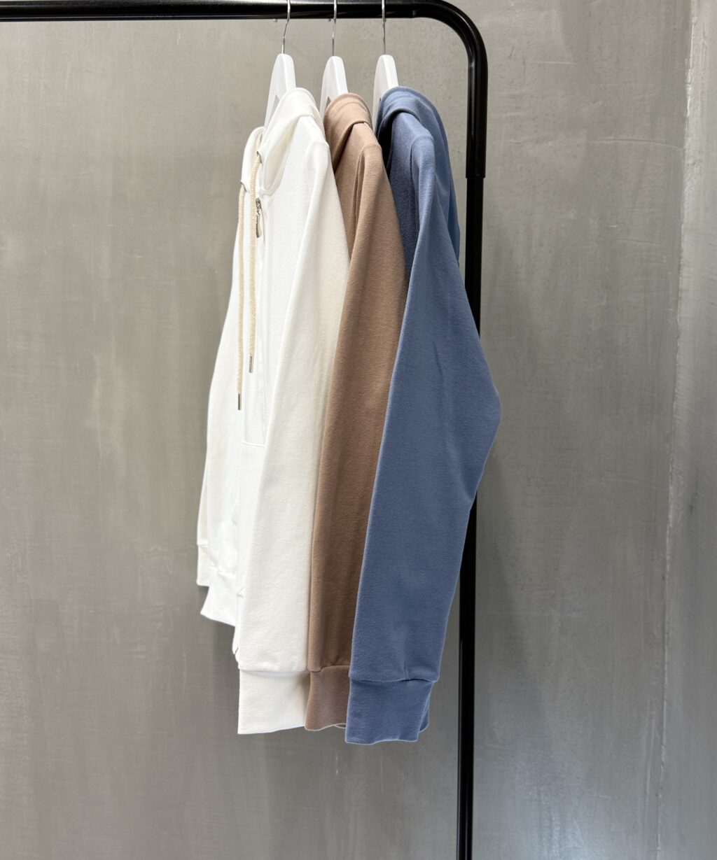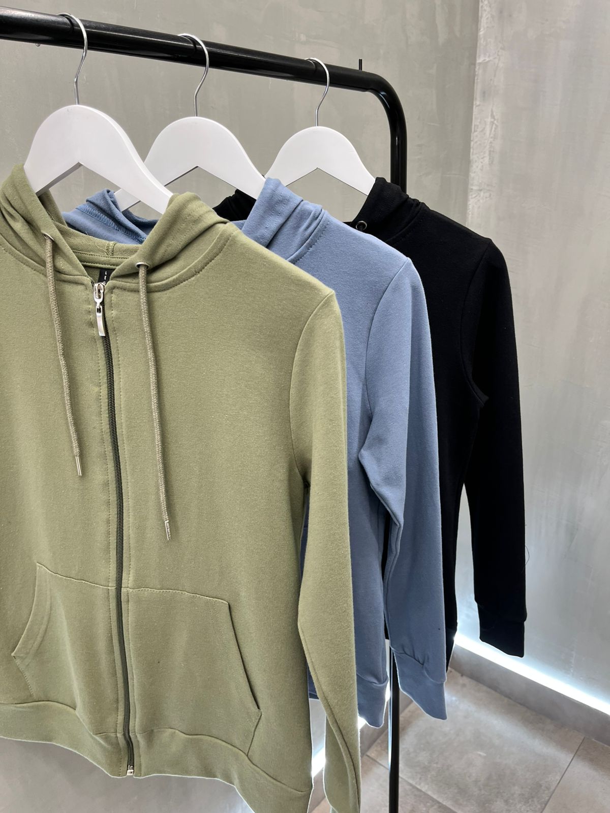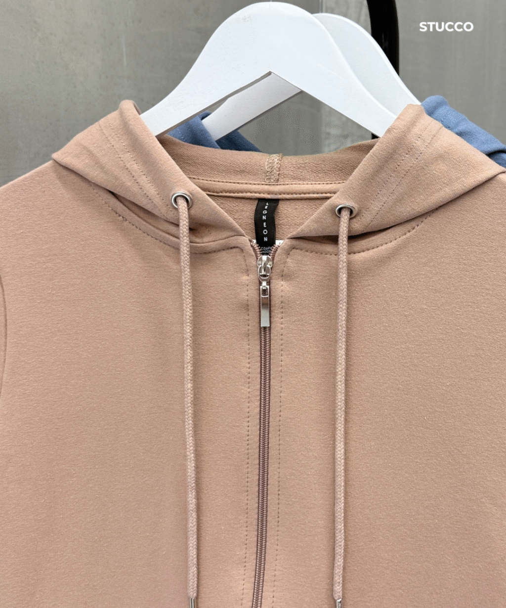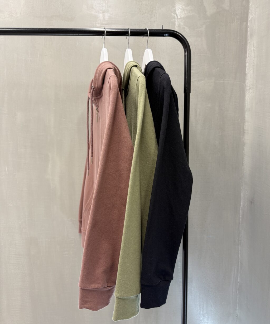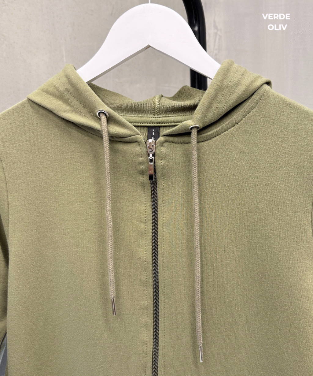 Campera en tela algodón Rustica con elastano, capucha y bosillos delanteros.