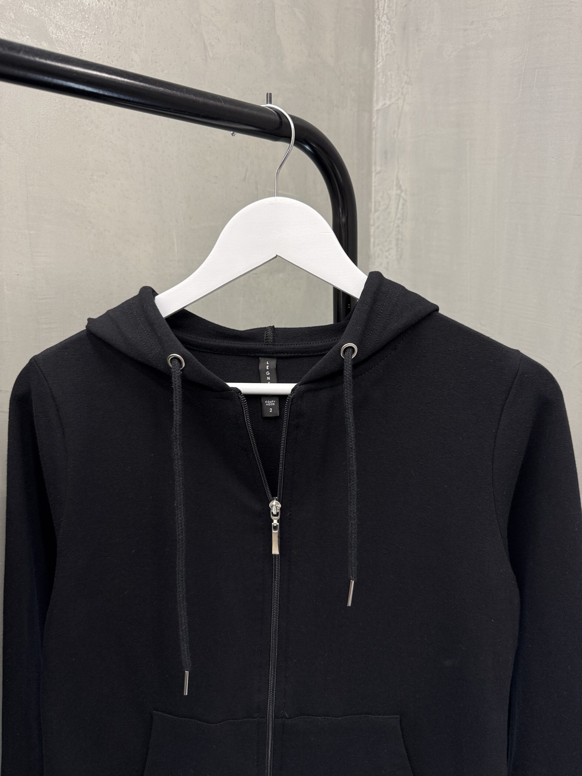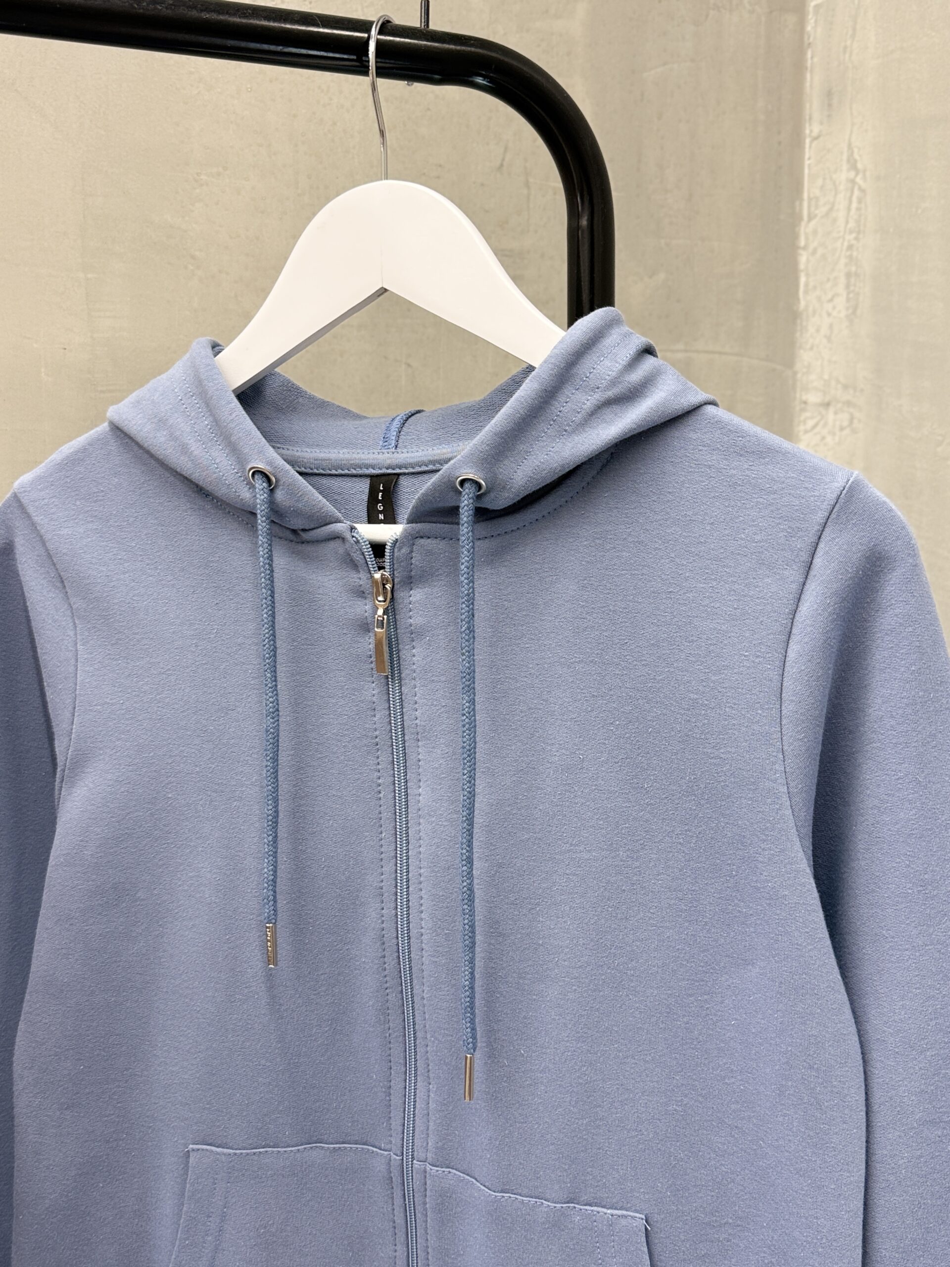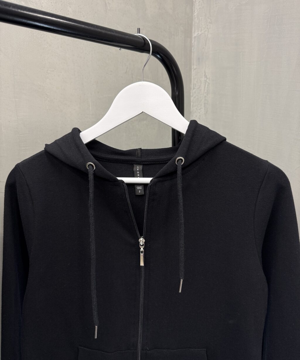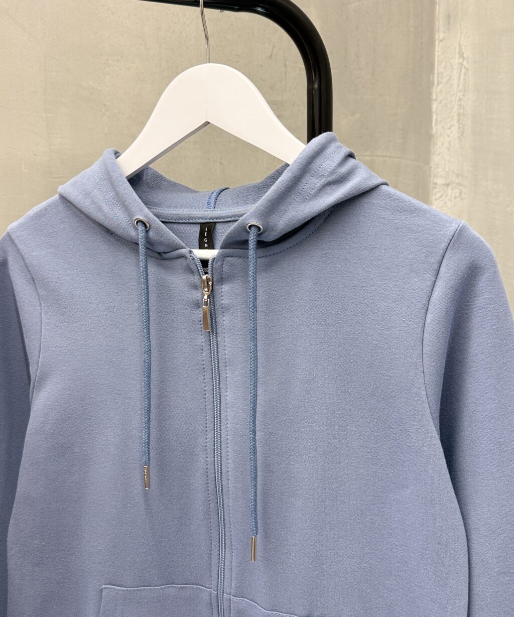 Campera en tela algodón Rustica con elastano, capucha y bosillos delanteros.