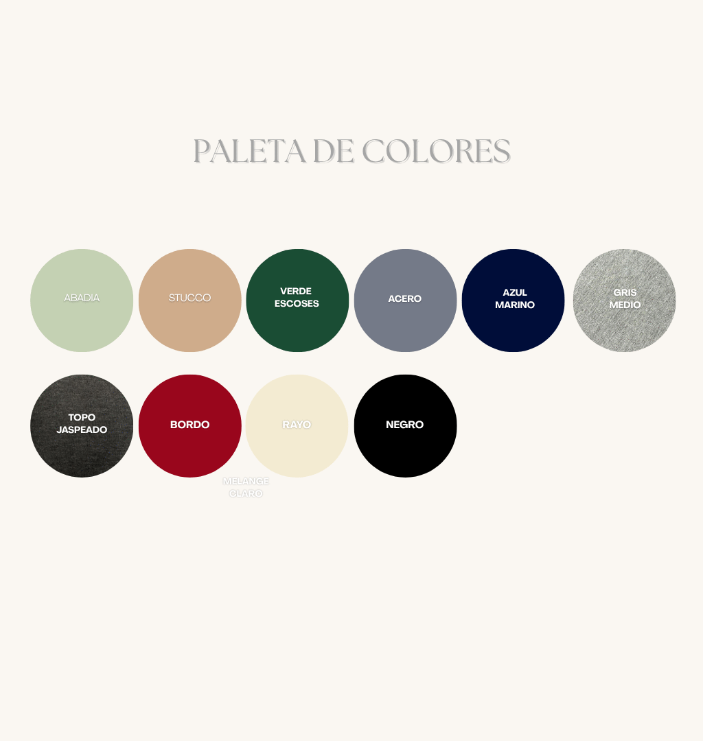 | Color | Abadia, Acero, Azul Marino, Bordo, Mge Medio 25, Negro, Rayo, Stucco, Topo Jaspeado, Verde Escoces |