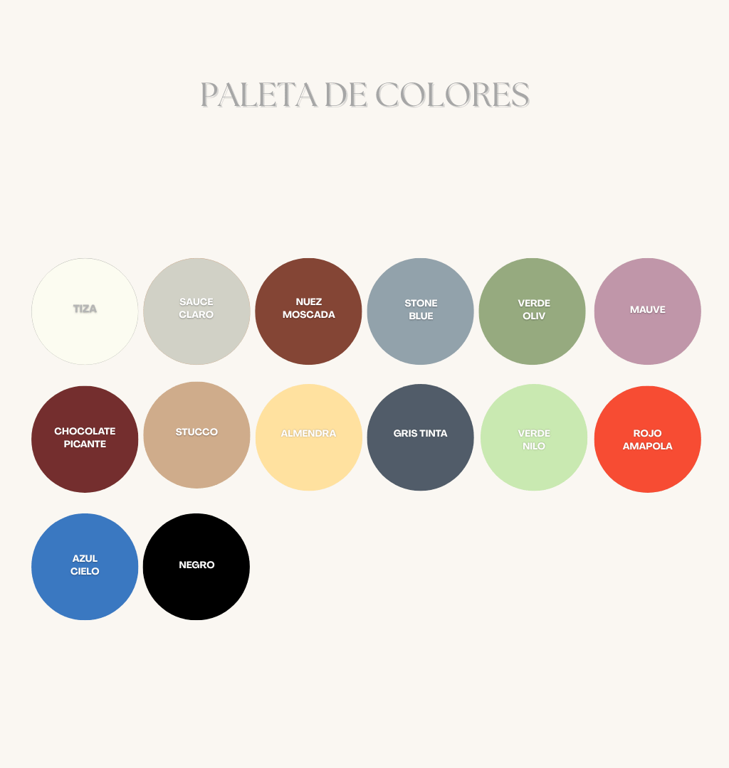 | Color | Chocolate Picante, Gris Tinta, Almendra, Azul Cielo, Mauve, Negro, Nuez Moscada, Rayo, Rojo Amapola, Sauce Claro, Stone Blue, Stucco, Tiza, Verde Navy, Verde Nilo, Verde Oliv |