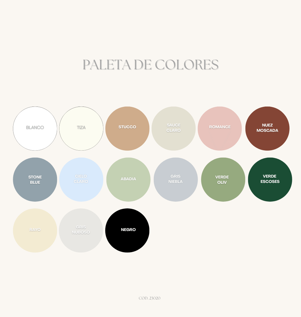 | Color | Cielo Claro, Gris Nuboso, Romance, Abadia, Almendra, Blanco, Gris Niebla, Negro, Nuez Moscada, Pelicano, Rayo, Sauce Claro, Siroco, Stone Blue, Stucco, Tiza, Verde Escoces, Verde Oliv |