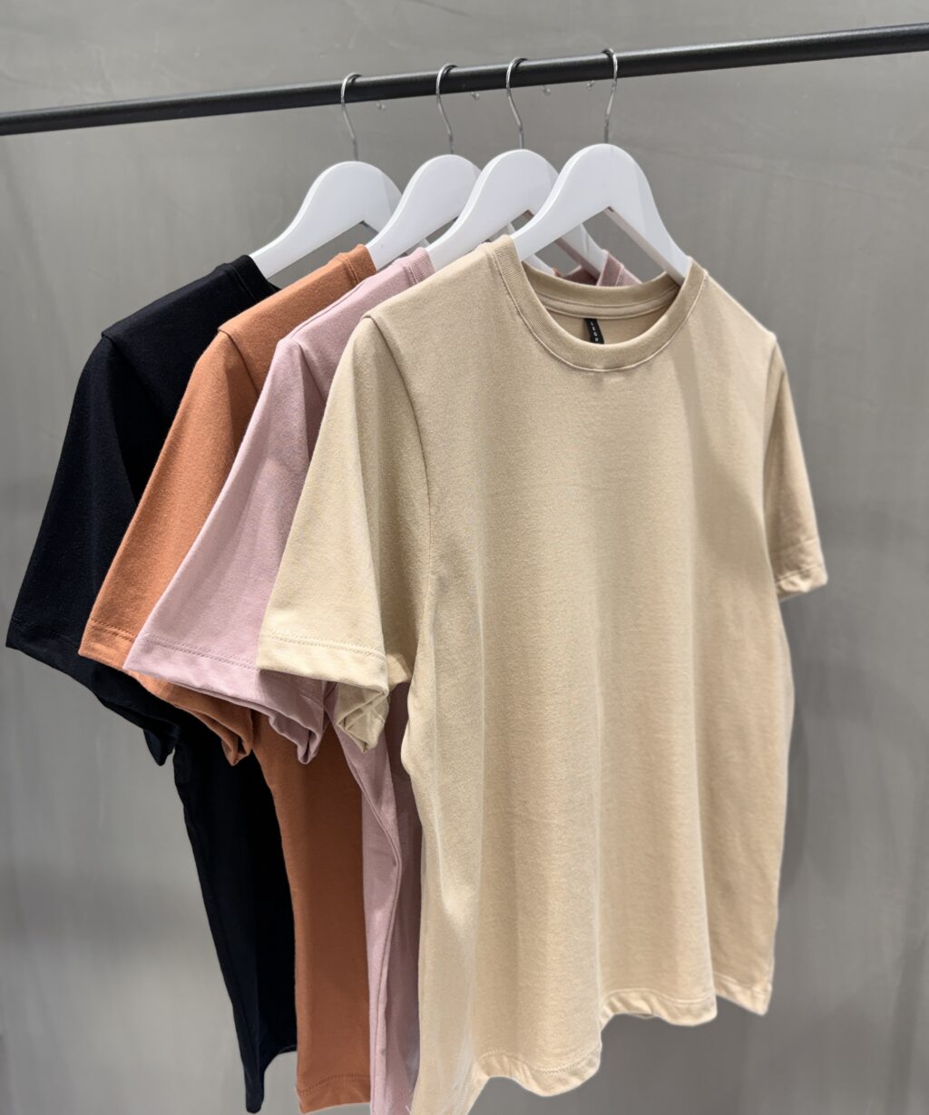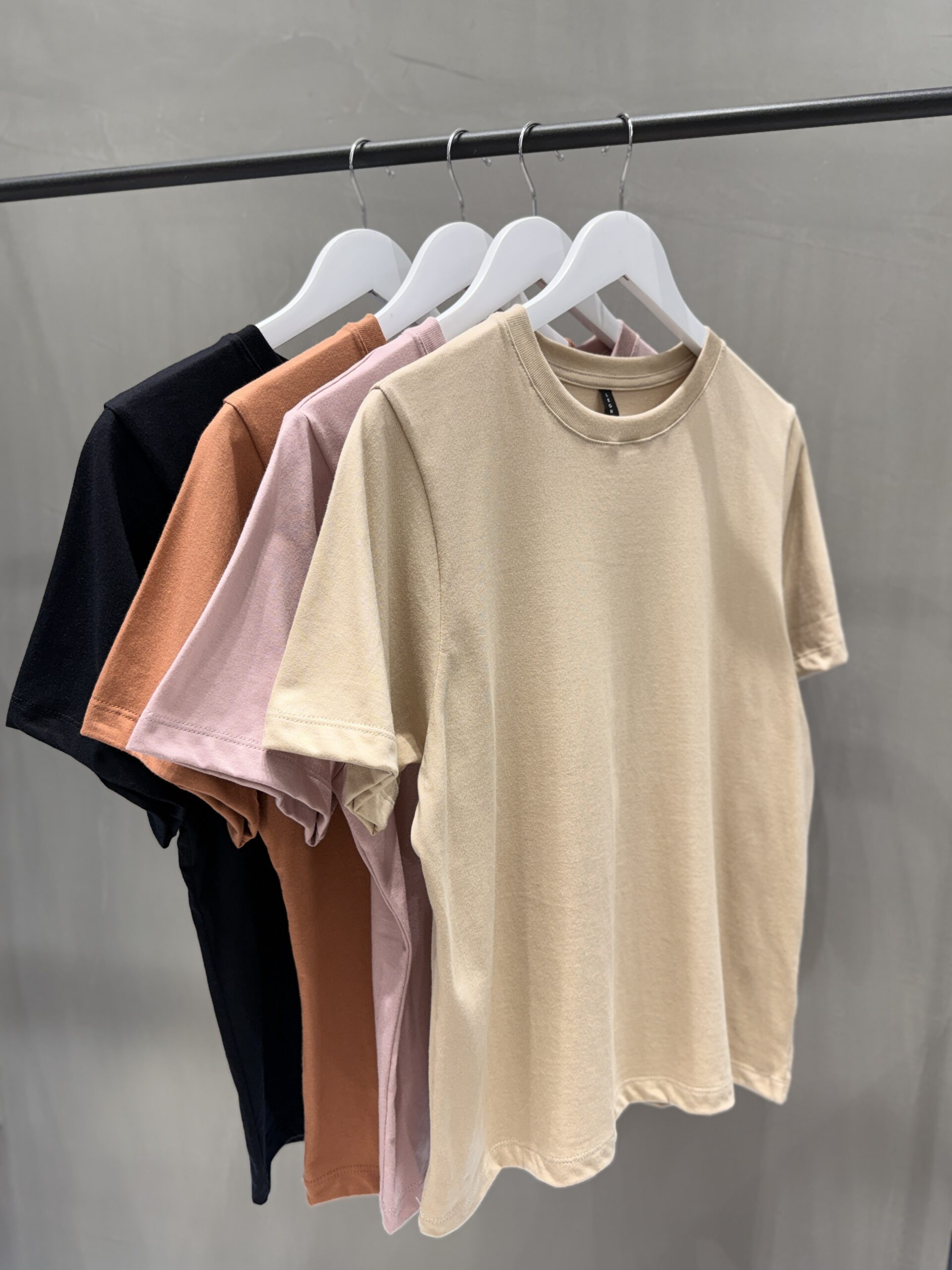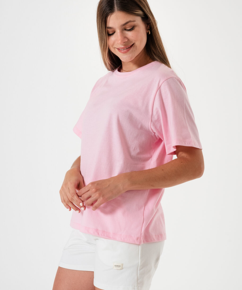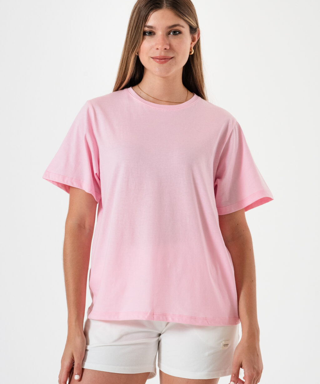 Remera básica amplia en tela Jersey 100% algodón, cuello redondo.