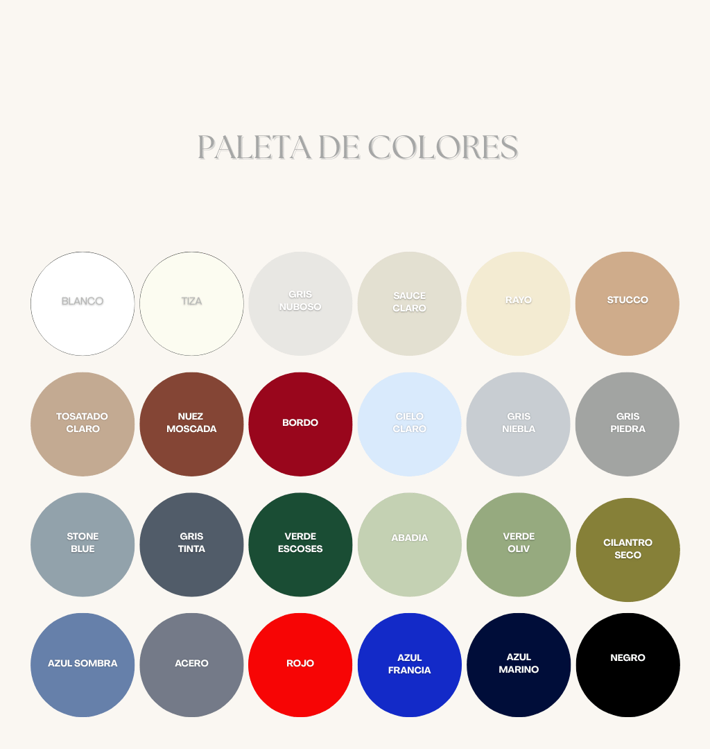 | Color | Cielo Claro, Gris Nuboso, Gris Piedra, Gris Tinta, Abadia, Acero, Azul Francia, Azul Marino, Azul Sombra, Blanco, Bordo, Celeste, Celeste Cielo, Celeste Sueño, Chocolate Sombra, Cilantro Seco, Gris Niebla, Gris Umbría, Malbec, Mge Claro 5, Mge Medio 25, Negro, Nuez Moscada, Rayo, Rojo, Sauce Claro, Stone Blue, Stucco, Tiza, Topo Jaspeado, Tostado Claro, Verde Escoces, Verde Oliv, Verde Silver |
