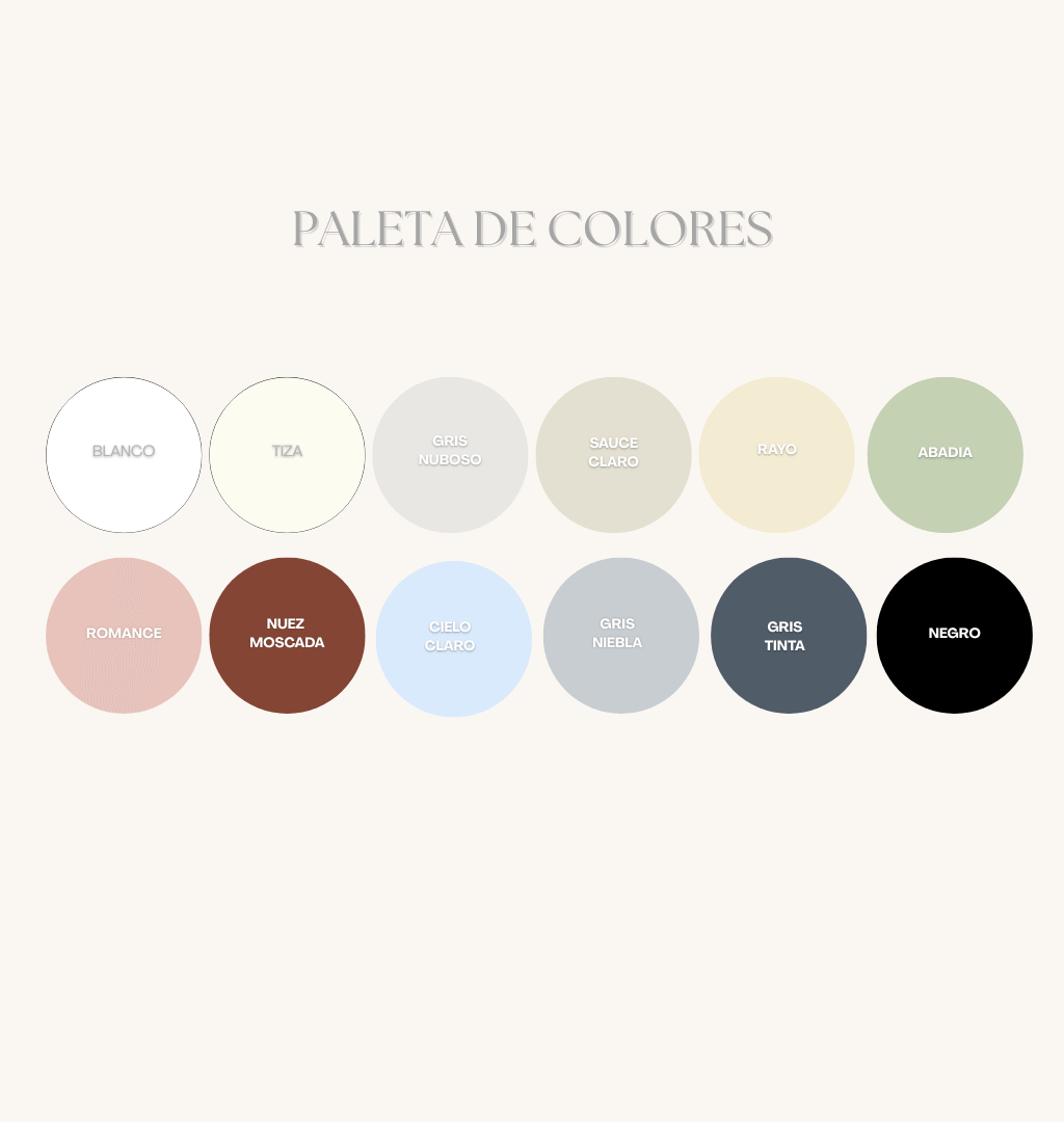 | Color | Cielo Claro, Gris Nuboso, Gris Tinta, Romance, Abadia, Almendra, Blanco, Gris Niebla, Mouse de Limon, Negro, Nuez Moscada, Pistacia, Rayo, Rosa Cuarzo, Sauce Claro, Siroco, Tiza |